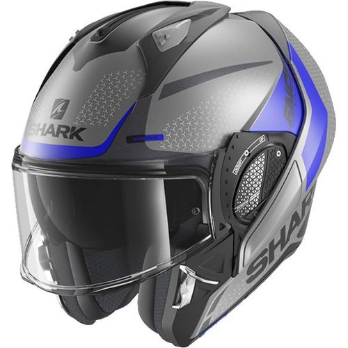 The Shark EVO GT Encke Mat ABK flip-front motorcycle helmet is a modular helmet made from lightweight, yet highly durable injected thermoplastic resin. It has two shell sizes to ensure a more aerodynamic and comfortable ride. A multi-density EPS liner gives superior protection, and this comes with an anti-scratch and anti-fog UV-resistant new class 1 optic visor with a quick visor release system and Shark's patented Auto-up / Auto-down system that automatically lifts the visor upon raising or lowering the chin guard - plus an internal sun visor. The EVO-GT helmet is exceptionally comfortable to wear thanks to the Easyfit system for glasses wearers, a removable and washable interior, magnetic and retractable soundproof chin cover and a slot reserved for the Sharktooth intercom. It also comes with two sizes of cheek pads in the box and a Pinlock 120 Max Vision VZ250 insert. The air circulation is personalised thanks to 3 air inlets and two air extractors, and this has a micro lock buckle system. Available in a choice of colours - this is the Encke anthracite blue and black in a mat finish.