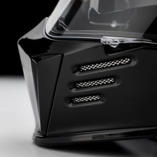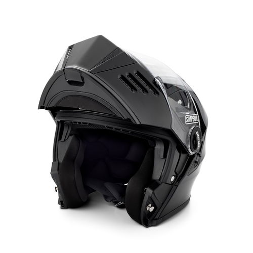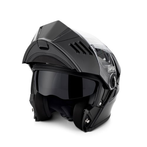 A tri-composite flip-front motorcycle helmet, the Simpson Darksome motorcycle helmet offers ECE-22.06 certification and is a lightweight 1510g (+-m) thanks to the tri-composite blend construction (carbon, Kevlar and fibreglass). Three outer shell sizes ensure optimum comfort and superior aerodynamics for all head sizes. The inner comfort lining is removable and washable, and the Darksome helmet also has a comprehensive controlled ventilation system for personalised airflow. The DD ring closure is ultra-secure and adjustable, and it also features a drop-down sun visor. The main, clear, anti-scratch visor offers a visor locking system and controlled anti-fog airflow with the Pinlock 100% Max Vision insert included. The Darksome also has recesses for Bluetooth headsets. Available in a choice of colours - this is the plain black in a gloss finish.