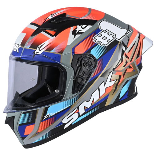 The SMK Stellar Sport Uno helmet is a full-face motorcycle helmet made from EIRT (Energy Impact Resistant Thermoplastic) with multi-density EPS and two shell sizes for added aerodynamics and reduced weight. The extra-wide, replaceable visor provides an excellent view of the road. The visor is anti-scratch treated with a quick-release system for easy changing. The Stellar comes with both a clear and dark visor (both anti-scratch treated). The inner lining is removable, washable, breathable, hypoallergenic, and made from a moisture-management, anti-static fabric for superior comfort. The chin strap is padded for comfort, and the Stellar also comes with a breath deflector and a wind protector to prevent the visor from fogging and for additional comfort. Speaker pockets are a convenient feature along with an aerodynamic spoiler. The ventilation system with a chin air vent, a top air vent, and an exhaust on the spoiler provides outstanding airflow, and it is ECE 22.06 certified with a quick-release strap.