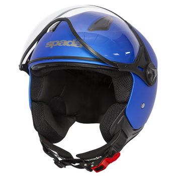 The Spada Hellion open-face motorcycle helmet offers a sleek touring style with a compact, streamlined shell. It has two shell sizes to prevent bulk and buffering, and it improves comfort with a fully removable and washable lining. The shaped anti-scratch visor provides superior vision, and the Hellion features three vents for internal airflow and excellent air circulation. It is ECE 22.05 approved and features a quick-release chin strap fastening for an adjustable yet ultra-secure closure.