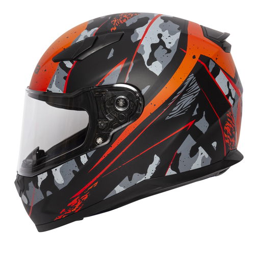 The Spada Raiden full-face motorcycle helmet in camo orange is made from an impact-resistant thermoplastic shell and is ECE 2205 approved. Four vents in key areas provide optimum airflow, and an integrated rear spoiler enhances aerodynamics and air expulsion. The Raiden comes with a breath guard, chin curtain, and a fully removable, washable lining. A quick-release chin strap fastening gives a secure and adjustable closure. The clear anti-scratch treated visor is quick-release for easy changing and Pinlock prepared.