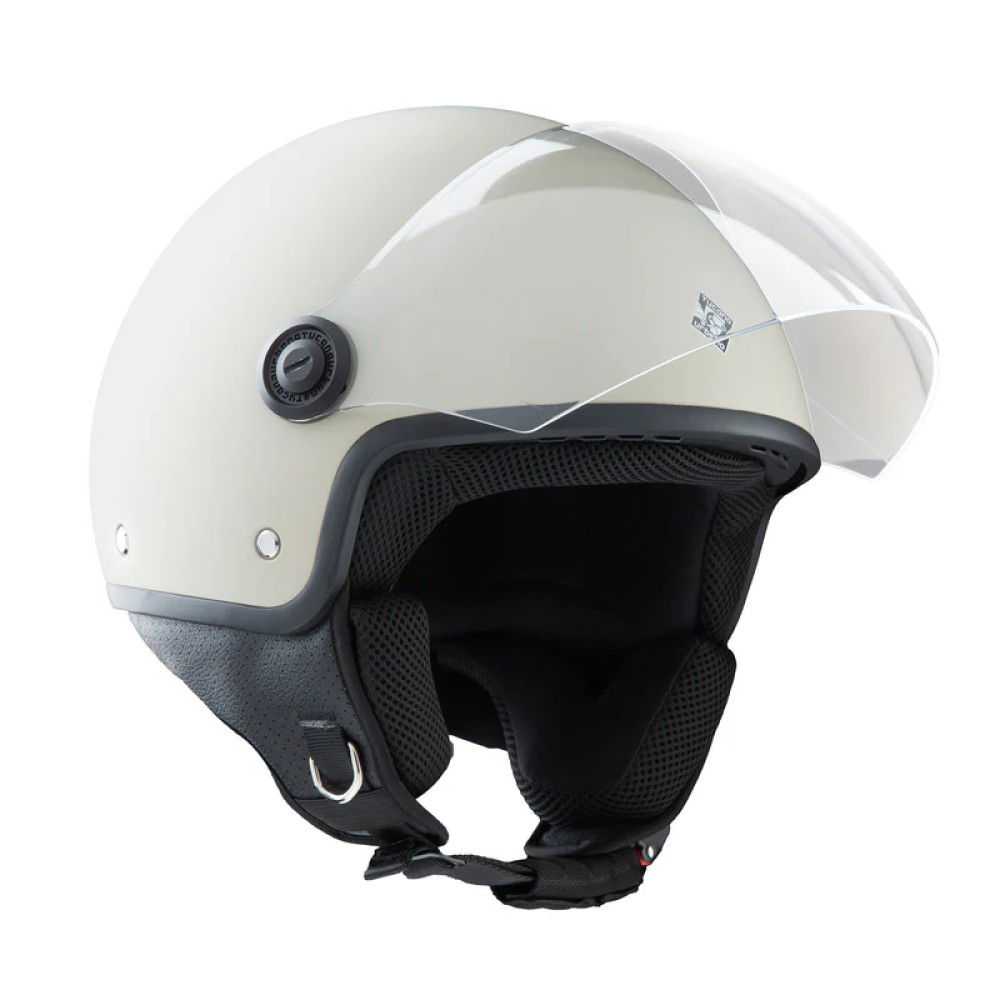 The Tucano Urbano El Jettin 6 open-face motorcycle helmet in matt sand is made from ultra-lightweight yet protective thermoplastic Polycarbonate with an inner high-impact dual-density EPS. It offers excellent visibility with a polycarbonate class A-approved anti-scratch treated clear visor and an anti-scratch silicone visor cover. A luxury thermoformed lining to reduce seams offers maximum comfort with breathable, hypoallergenic microfibre Aero 3D mesh inserts that are removable and washable. Detachable and washable cheek pads for use in the summer, and the strap offers an anti-irritant microfibre under-chin fastener. The lining gives ample and comfortable space around the ears, and the El Jettin helmet offers a perforated eco-leather and Aero 3D mesh neck roll for excellent breathability and greater comfort. The quick-release micrometric closure system provides a secure and adjustable fit, and this is ECE 22.06 certified. Other colours are also available.
