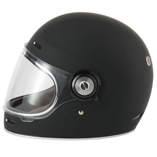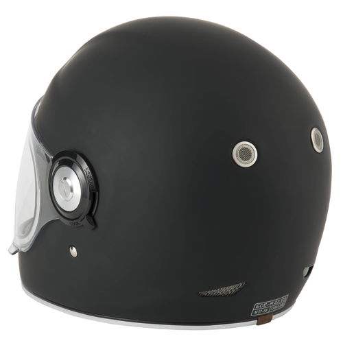 The Vcan H135 Retro Matt Black motorcycle helmet is full-face with vintage styling but modern safety features. Made from ultra-lightweight but highly durable fibreglass, the V135 also has a luxurious tan faux leather and suede comfort lining, a moulded anti-scratch visor, and a full ventilation system with chin and crown intake vents and rear outlets for optimum airflow. The visor locks and it also has a double D-ring chin strap adjustable and secure closure system. ECE 22.06 certified. Other colours are also available.